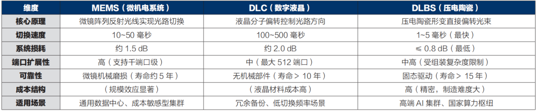 不过目前 OCS 领域也存在技术线路之争,MEMS(微机电系统)、 DLC(数字液晶)和 DLBS(压电陶瓷)三条主要的技术线路并存,其中压电陶瓷技术凭借光路直接传输无反射损耗、切换时延低至毫秒级等优势,成为谷歌重点测试方向。其系统损耗最低、切换速度最快,特别适合高稳定性 AI 集群互联场景。该技术兼具正逆压电效应,能高效实现光电信号转换,拥有低能耗、无电磁噪声、寿命长等特点。