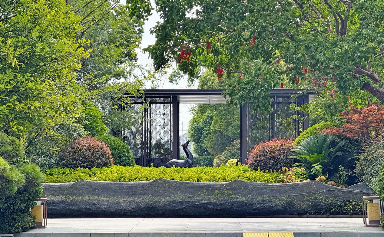 绕过圆形喷泉,便是小区中心花园,左侧的金桔和右侧的斜飘乌桕形成绿意隧道,结合休憩凉亭、小鹿雕塑,颇有一丝“绿野仙踪”意境。