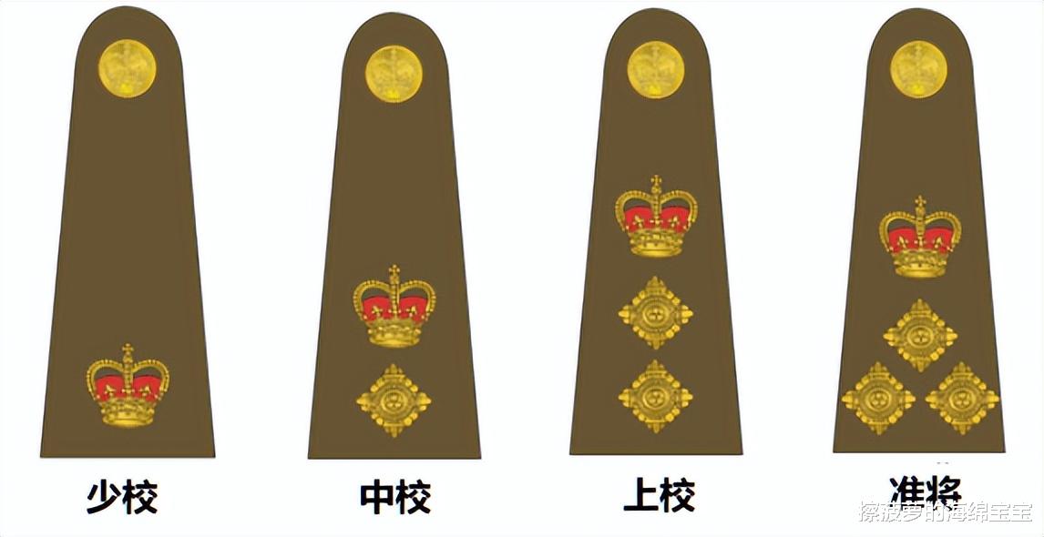 1922年之前,英国准将的英文名叫“Brigadier General”,当时英国准将是最低级的将官,高于上校,低于少将,军衔标志为权杖和指挥刀,而少将及以上将官的军衔标志就是在准将上增加了军衔星和皇冠。