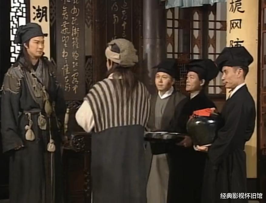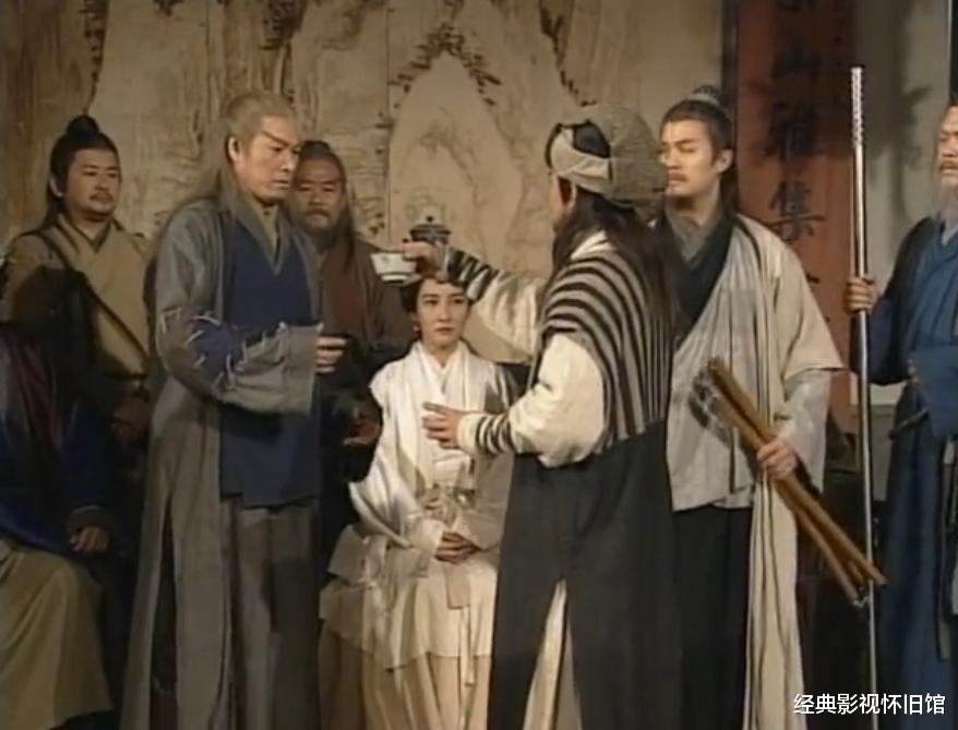 我们不妨来看几个镜头对比一下,就是众位英雄在聚贤庄商讨怎么对付乔峰的时候,乔峰用喝断义酒的方式和大家绝交,瞧他站在全冠清前面时,全冠清比他高出了至少半个头,这两个人的身高对比很是明显。