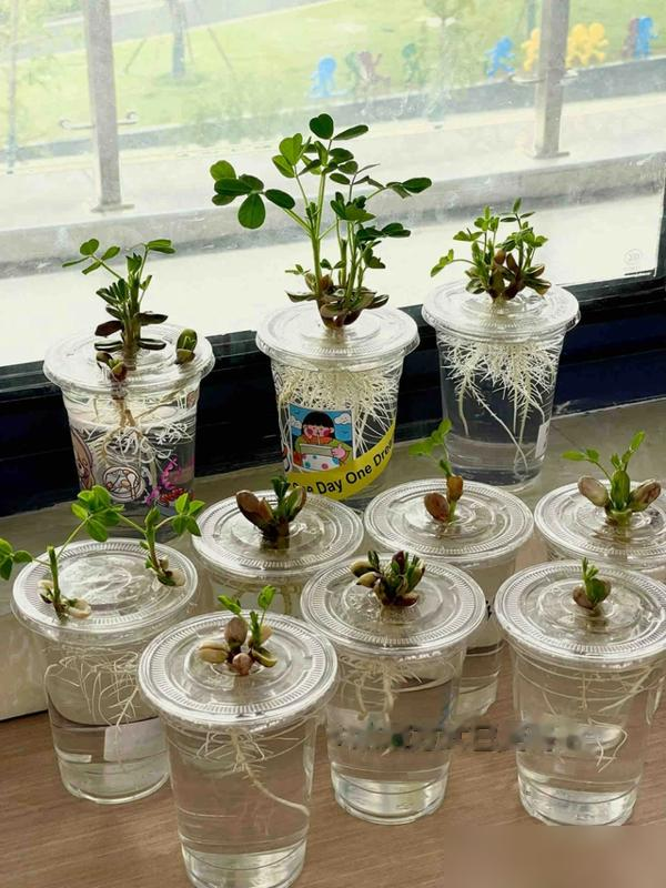 比如荔枝核,吃完荔枝把核搓洗干净,晾半天后泡水里,4-5天就能冒白芽;芽尖冒出来后,用泡沫网兜住,让根尖接触水面,避光养着,叶子会粉粉嫩嫩的,像朵小荷花。