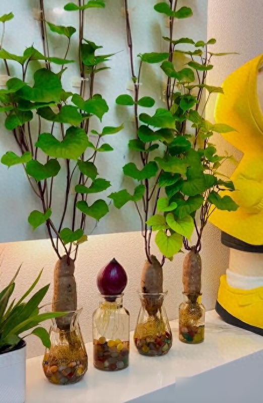最绝的是白菜根,水培20天能开出小黄花,金黄的花簇配着翠绿的叶,工位秒变“小花园”。
