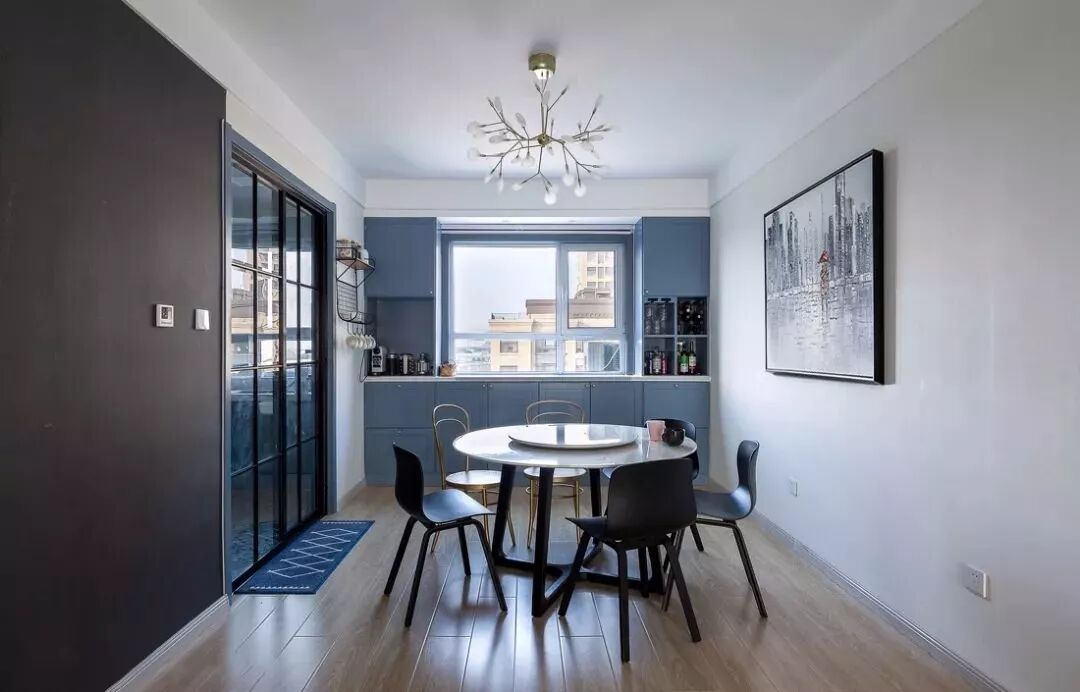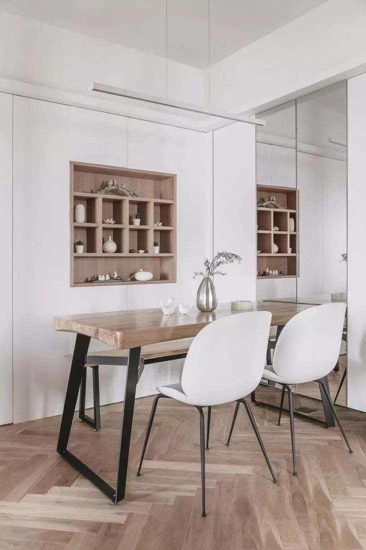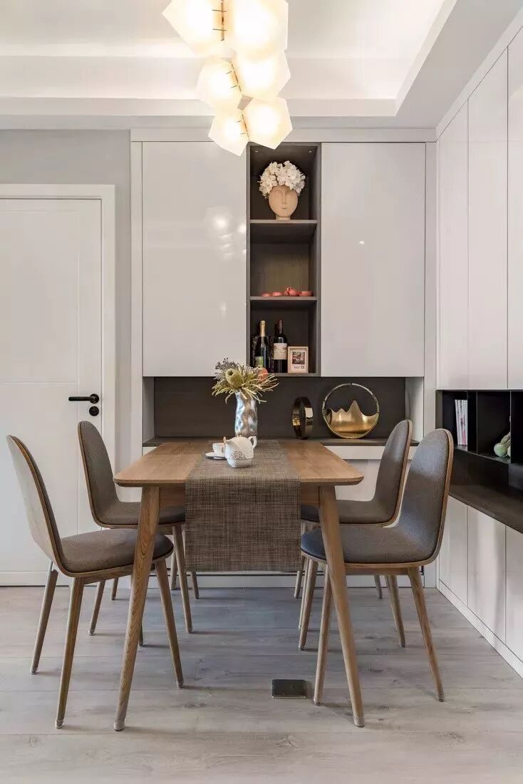 小户型的餐厅墙面比较适合做嵌入式的餐边柜,因为餐厅的面积往往不是很宽裕,利用墙内空间来做收纳,能节约不少面积。