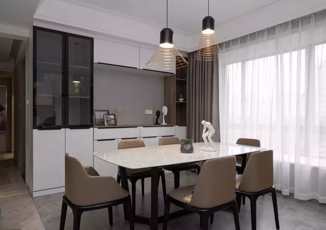 餐边柜的设计需要根据餐厅的具体位置、形状来定,比如靠着窗户的,就可以沿着窗户来做矮柜和双高柜的设计,这样设计还可以作为西厨操作台使用。