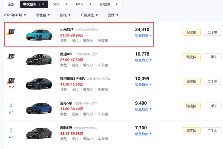 小米SU7当前市场热度有多高,月销量位居同类细分市场头部位置,优于奥迪A6L、宝马5系、奔驰E级等老牌豪华传统燃油车。甚