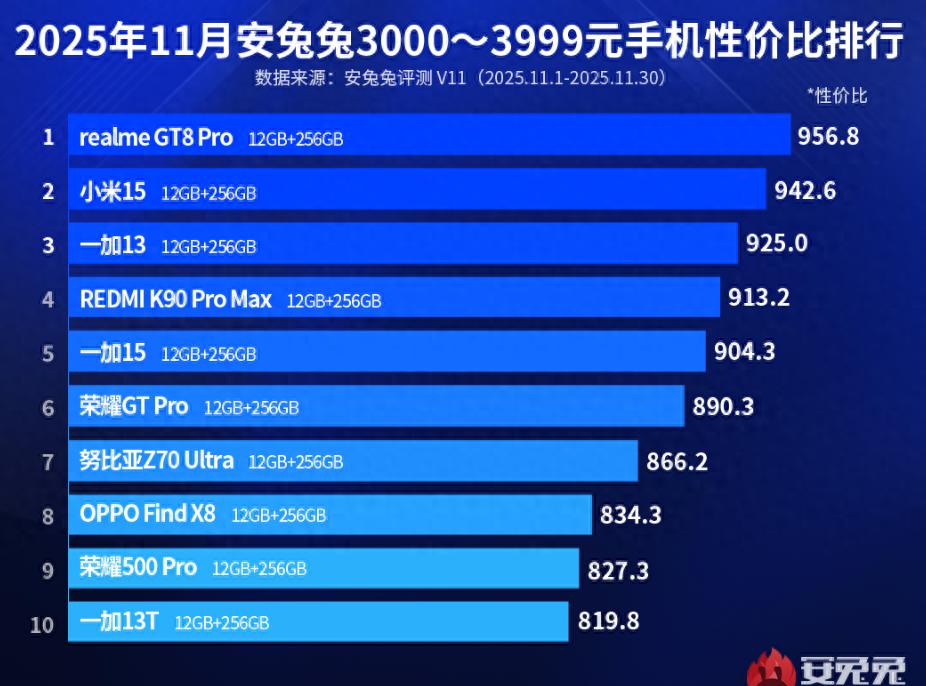 3000价位手机性价比排名更新,第一名出乎意料,REDMI跌至第四