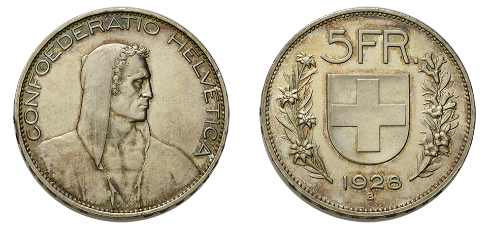 尽管关于生产新款5法郎钱币的法案直到1931年9月9日才通过,但在1928年夏天,人们已经清楚它将使用更少的银来制造。并且由于银价几乎占了造币成本的全部,因此将1928年的23971枚5法郎钱币发行出去对国家来说是不经济的,所以其中大部分仍然保留在国家银行。它们从瑞士国民银行的柜台被直接送到铸币厂,被回炉铸造成新的5法郎钱币。这就是为什么瑞士1928年的5法郎钱币,存世量比预期的要稀少得多的原因。