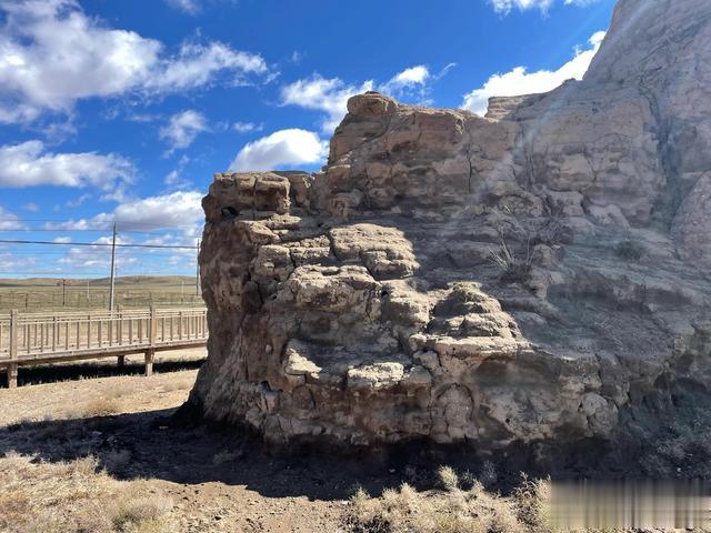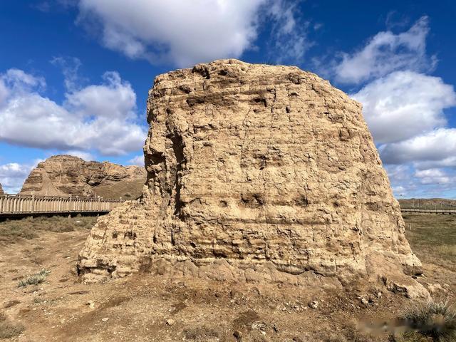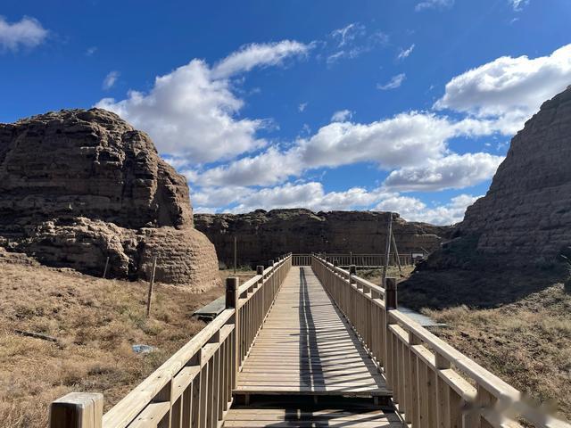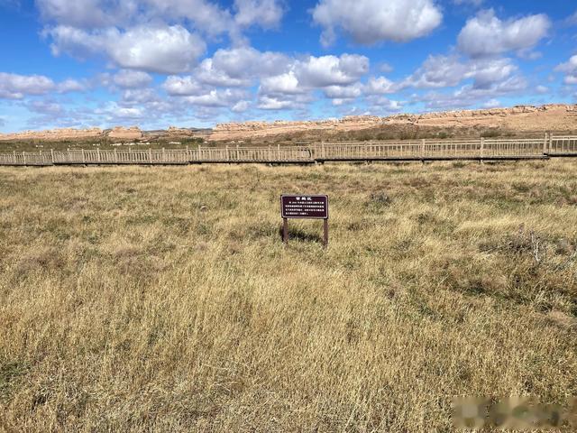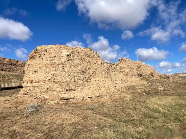 进入城门后步行在新修的栈道参观领略这种宏伟的古城址,城内栈道由南—东—北—东—西方向建造,沿着城内东侧、北侧、城外南墙一段供游客参观,想必这一片区域应该是城内精华部分,栈道下城内地表插有诸如瓮城、东城墙、宫殿区等示意牌,方便游人更直接的去了解古城的布局。当我们走到栈道北侧远眺城址北墙时,有一种一眼望不到头的感觉,北墙以北国道上川流不息的大货车,仿佛是穿越回遥远的古代,源源不断给城内运送着粮草补给。关于这座建在阴山以北草原上的神秘孤城,人们议论最多的还是它的建造年代,有持匈奴王城说、有持汉外受降城说、有持唐代燕然都护府或可敦城说、有持西夏时期黑山威福军司下辖城址说等,最新的观点认为该古城事唐代大将郭子仪驻守的横塞军所在地,只可惜耗费巨额成本建造的这种大型军事重镇因当地土地不适宜屯垦,无法满足城内戍边将士战马粮草方面的补给,最终不得不放弃而转移至天德军驻防,算是在大唐史乃至华夏史上极为少见在军事决策上出现的重大失误。总之,关于这座城址建造年代及其他不是我们这次行程讨论的焦点,能够目睹它的真容,感受塞外历史沧桑的厚重感,则是我们前往探寻的目的。