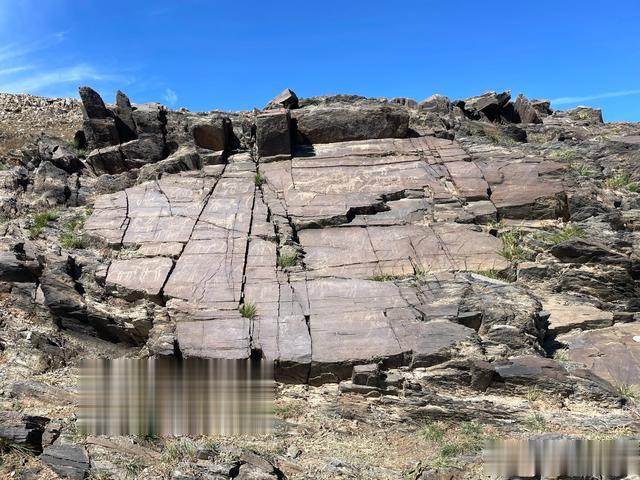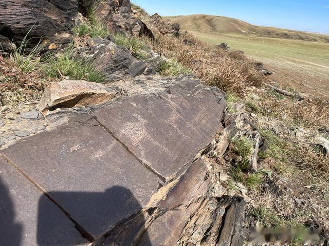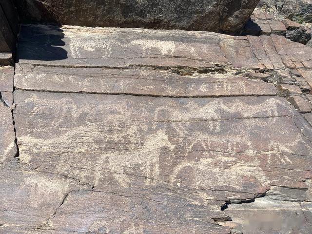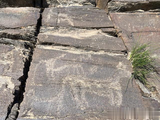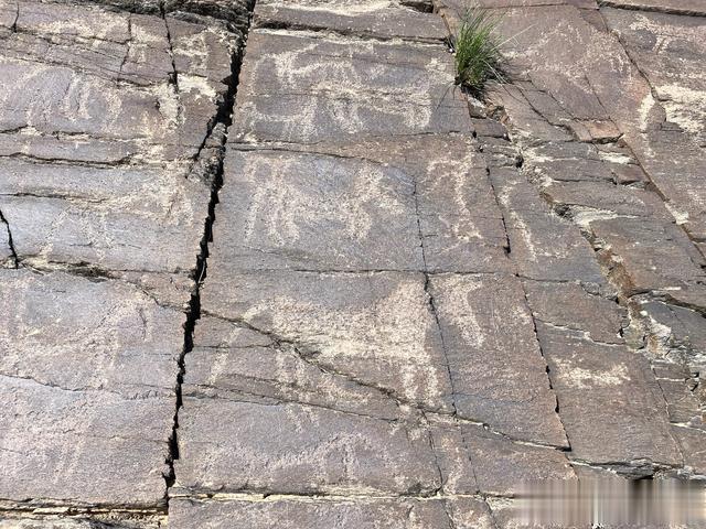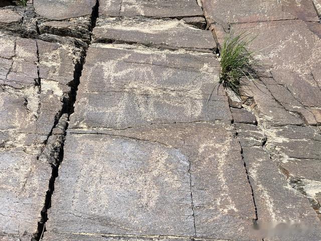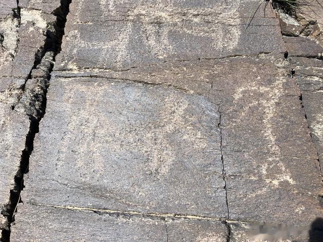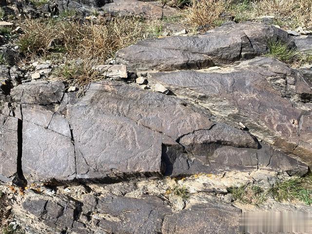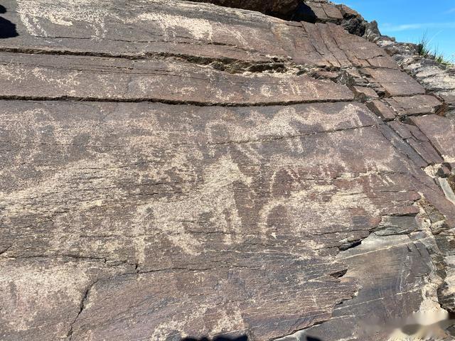 同行韩老师是岩画爱好者,当我们爬到山半坡看到凿刻在黑褐色岩石表面上的《牧马图》时,他难掩激动心情,高喊到:“太漂亮了!太壮观了!”。确实,这幅遗存至今已有上千年的岩画保存完好实属不易,我们能够找到看到,更是幸运。墙盘岩画除了主体这幅《牧马图》外,在其右侧还有北山羊等其他动物岩刻。之后我和韩老师继续向山顶爬去看看能否找到其它岩画,找了半个多小时没有发现岩画遗存。