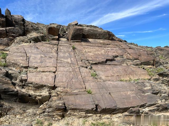 包头境内岩画少量分布于固阳县境内,如秦长城天面此老段、前公中村“鹿回头”岩画;石拐区境内仅发现一处腮大坝蛇岩画,其余大部分岩画分布在广袤的达茂联合旗境内,这里的岩画雕凿在漠南草原深处岩脉、裸露山岩之上,也被称为草原岩画。这些“草原图腾”的创造者,最早可追溯到新石器时代,后来这里成为了众多游牧民族逐水草而居的领地,一些没有创造属于自己文字的族群用原始古朴的方法,用打磨尖锐的工具将他们的所见所闻、内心世界的情感表达、神灵崇拜等等凿刻在平整光滑的岩面上,成为了草原上古老的天书、岩石上的呼麦。