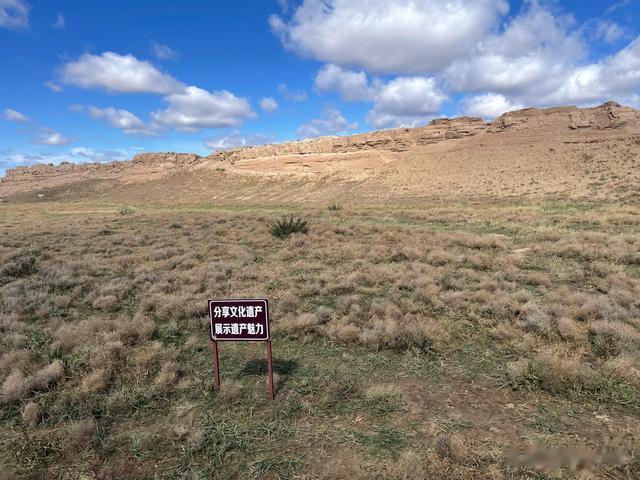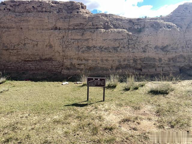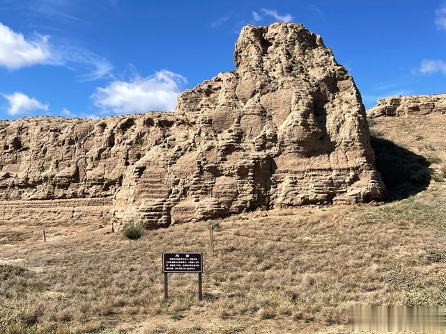 来到心忽热古城址外侧后,看到新建的横塞军府城门,旁边树立有文物保护石碑和古城简介牌,通过阅读了解该古城方面内容,认为简介牌上写的内容更为详细准确。