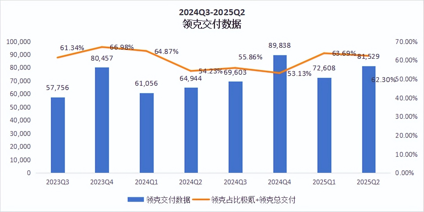 事实上,从去年第三季度到今年第二季度,领克的销量在整个极氪+领克总销量的占比一直都在一半以上,二季度更是达到了62.3%。