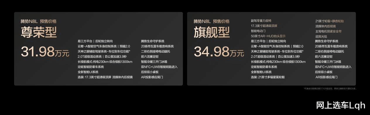 9月26日,腾势汽车全新大六座安全豪华SUV——腾势N8L正式开启预售,预售价31.98万至34.98万元。作为与科技安全旗舰SUV腾势N9一脉相承的家庭豪华伙伴,腾势N8L与腾势N9共同构成了腾势品牌独有的旗舰豪华双子星矩阵,分别瞄准不同细分市场。