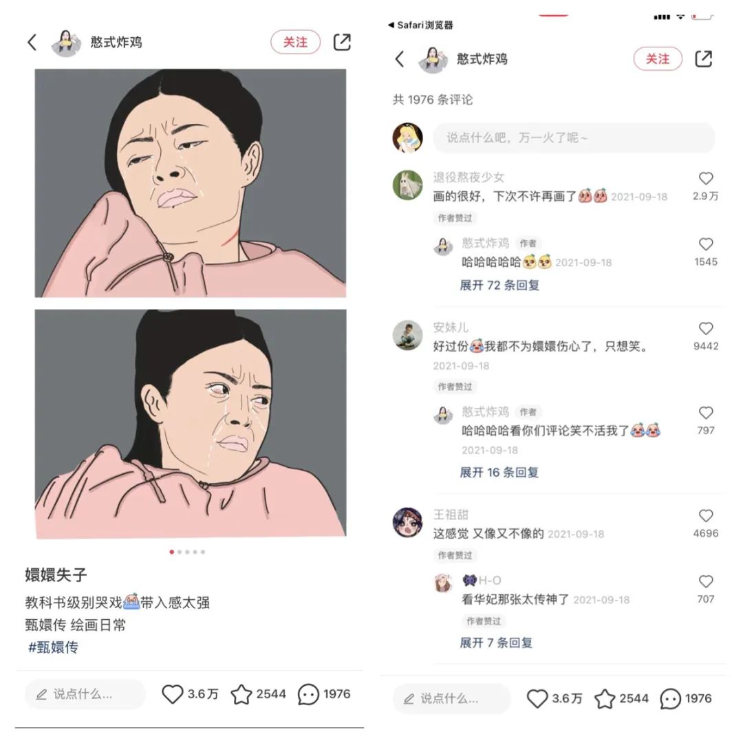 这样的趋势源于弹幕、自媒体和移动端社交平台的兴起和普及,观众看《甄嬛传》的内容和模式更自由了。不少基于《甄嬛传》的戏仿和在配音视频也开始出现,并收获大量关注。很多人对剧集和人物了解深入,但甚至可能没有完整看过一遍《甄嬛传》,而是在小红书上,通过各种各样的二创,构建了一个模糊的“甄嬛传”。