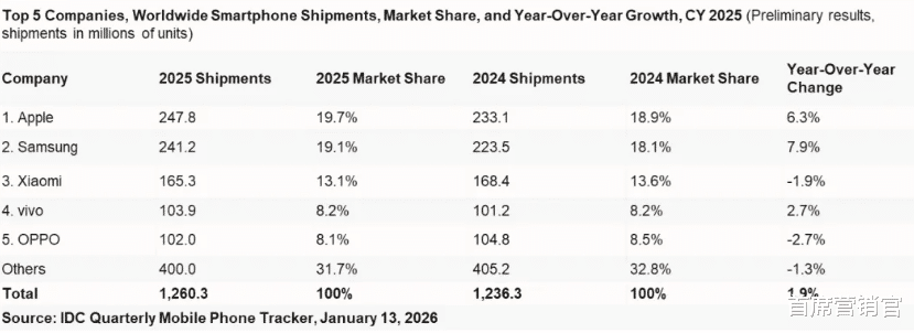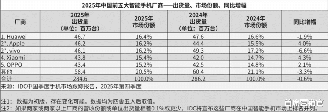 IDC数据显示,2025年第四季度,中国智能手机出货量同比微降,而苹果却以约21%的市场份额重新夺回了市场第一的位置。
