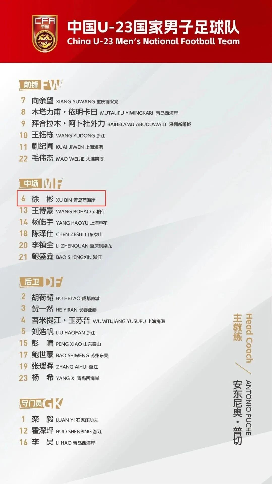 此前,2026亚足联U23亚洲杯中国队23人参赛名单公布,现效力于中超青岛西海岸的湖南籍球员徐彬入围。