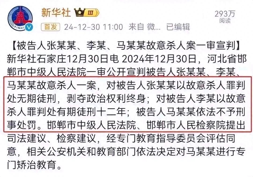 关于河北邯郸3初中生杀害同学并掩埋尸体一案,前两日已经做出了一审判决:张某某无期徒刑、李某某有期徒刑12年、马某某不予刑事处罚。
