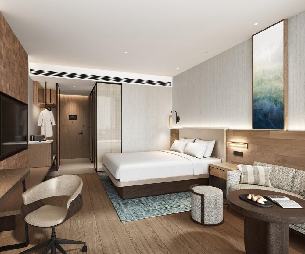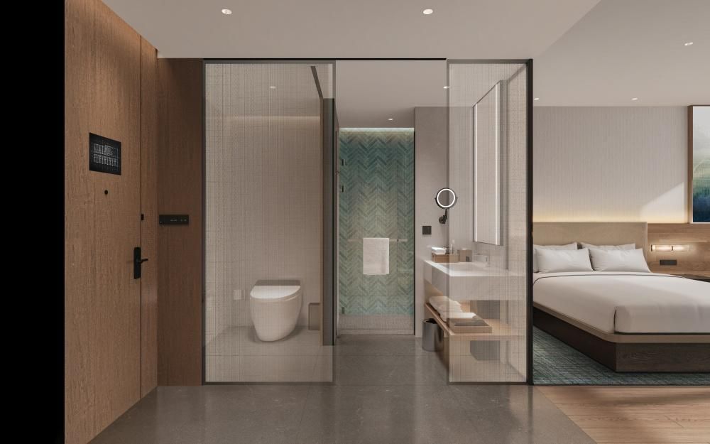 另一方面,焕新的客房延续“自然简约之美”,实现美学与功能的升级。自然质感的墙面、壁炉意象的木饰电视墙与蓝岭山脉轮廓的写意装饰画,彰显自然之美与从容自在氛围;针对商旅宾客快节奏的工作需求,客房引入“自在办公”概念,专门配备人体工学椅与护眼灯,办公桌可选配电动升降功能和无线充电,打造专注高效的自在办公体验;客房卫浴采用玻璃隔断结合实墙的布局设计,提升私密性并优化宾客体验,其中沐浴系统升级为嵌入式操作面板,在提升空间美感的同时让沐浴过程更直观便捷。