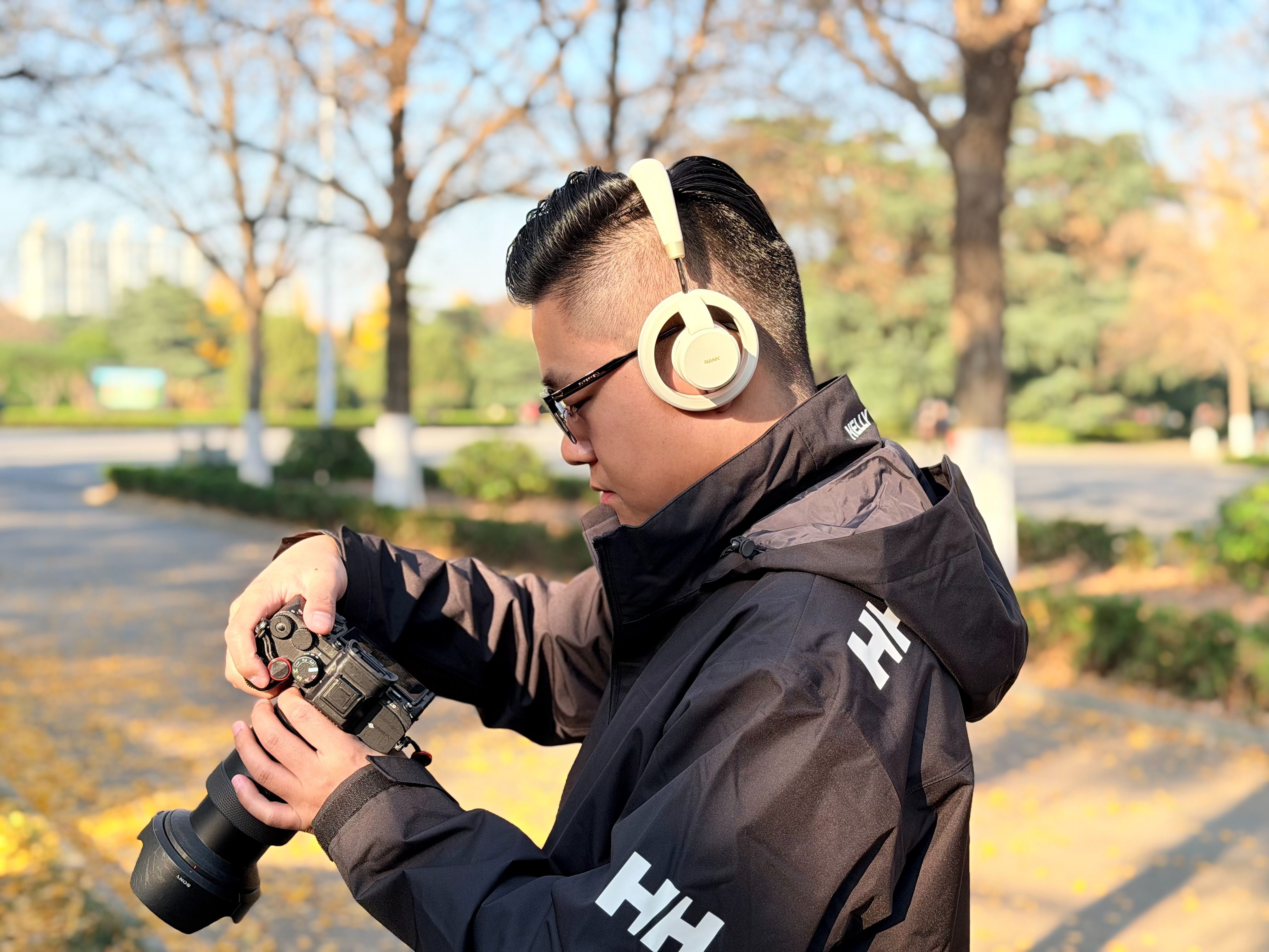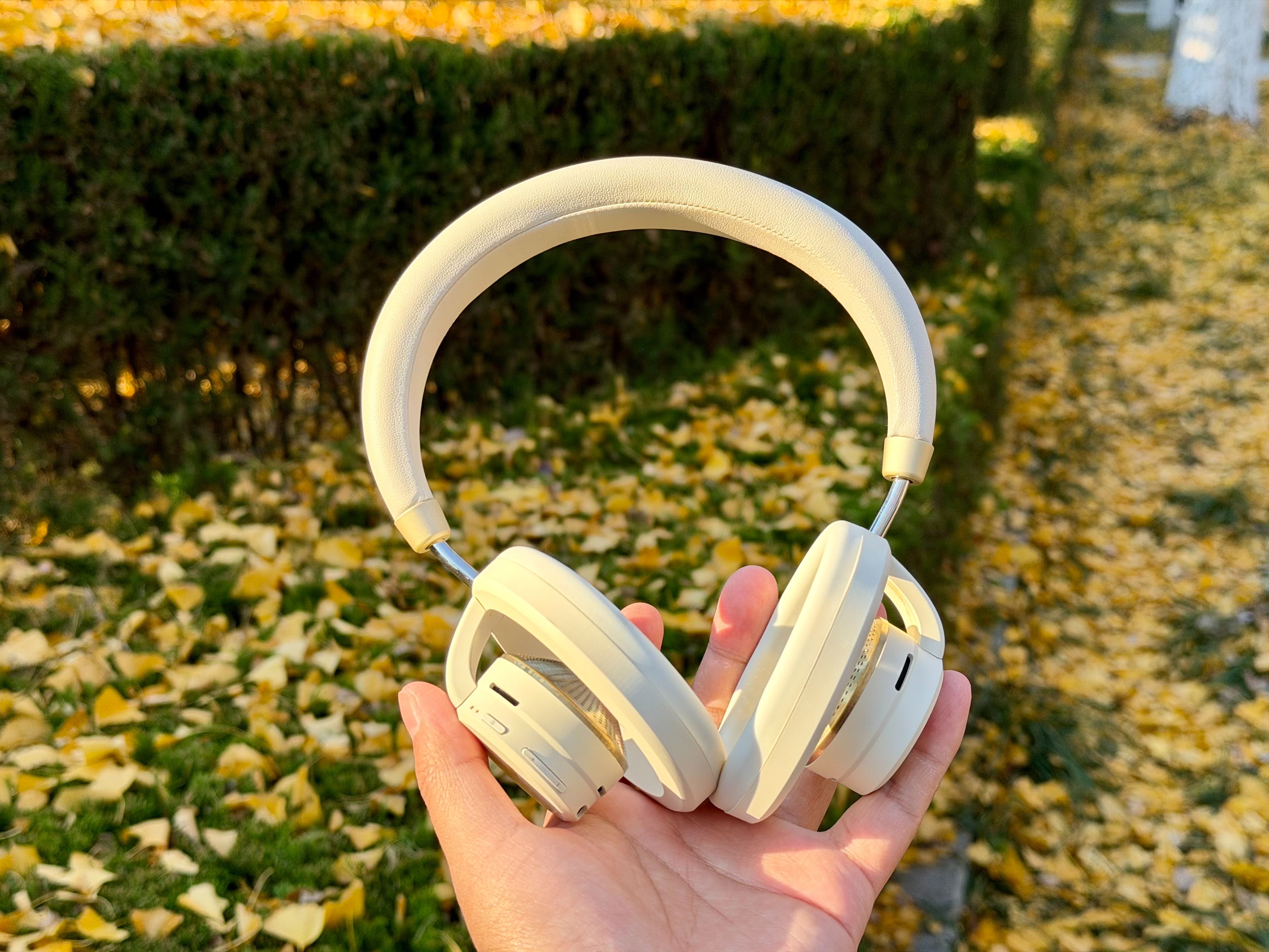 佩戴上,镂空耳罩 + 轻量化头梁,让它看着就不像传统封闭式那么厚重。实际上,它也只有169g,戴头上不会顶头发、夹耳朵,走一段路也不会有那种“头上挂俩碗”的负担。这些天温度还是比较低的,我发现它既不会让耳朵闷汗,也比直接吹冷风舒服很多。