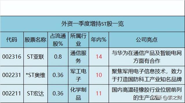 更令人惊讶的是,外资不仅大批量新进ST股,还增持了部分已有持仓的3家ST股票,分别为ST亚联、*ST奥维和ST宏达。