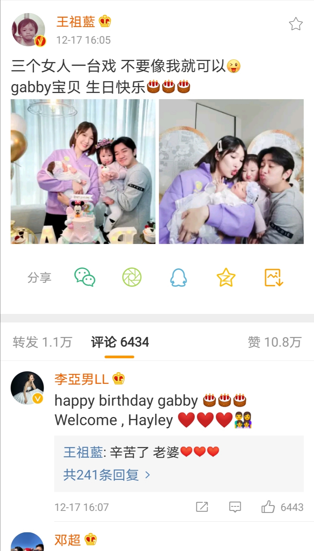 王祖蓝发文官宣二胎得女:每个成功的男人背后都会站着三个天使