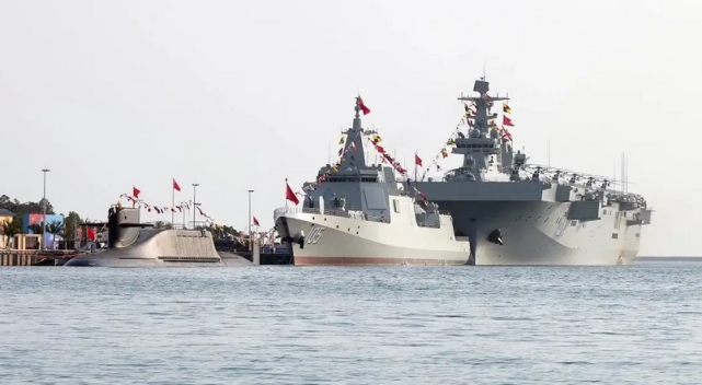 长征-18号战略核潜艇,2021年4月23日,在海南三亚某军港与075型两栖攻击舰首舰31“海南”舰和055型驱逐舰105“大连”舰集中交接入列南部战区海军,央视等国内媒体予以了空开报道,是极为罕见的现象。