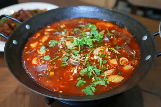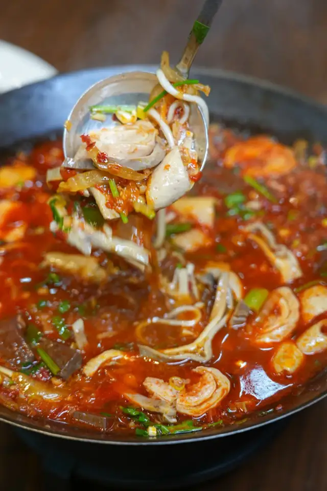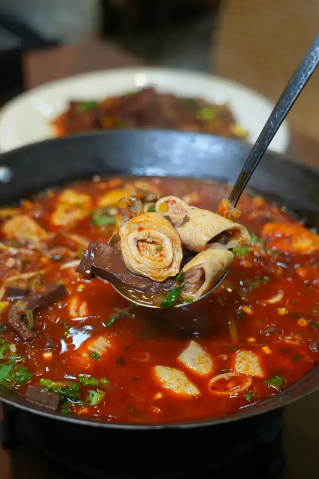 当中肉眼可见的猪血、肥肠,猪肚,加入清汤烩,汤选用猪的大骨汤!