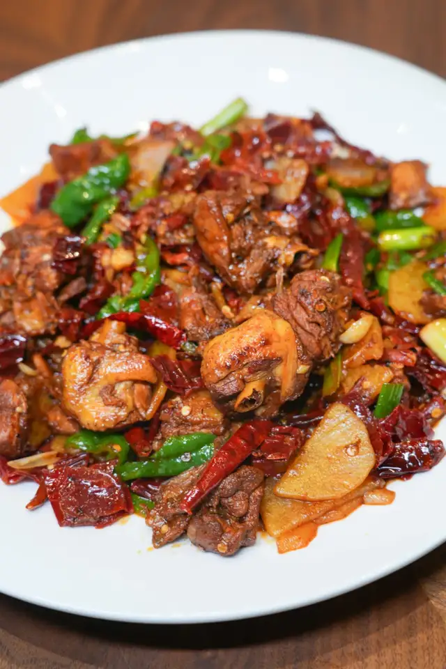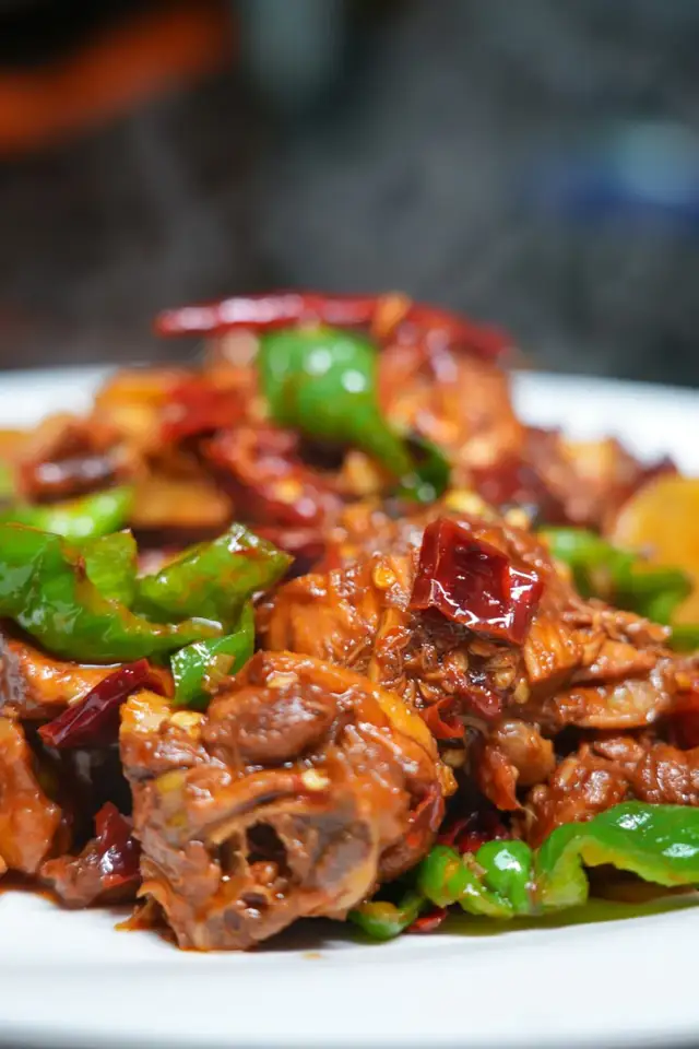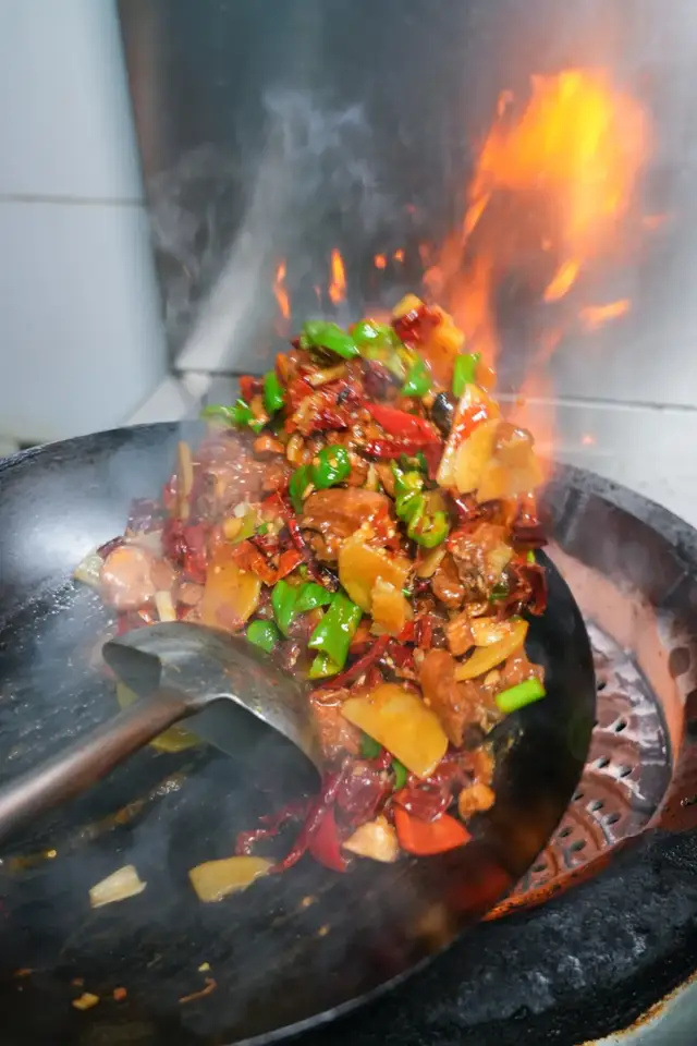 猛火现炒的过程里,就能感受到鸡肉的香气和辣皮子结合的那种香气,不是齁辣而是突出食材的香味。