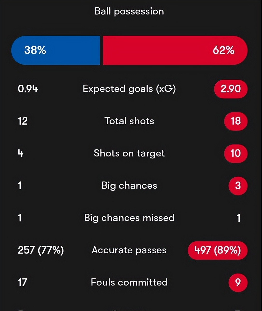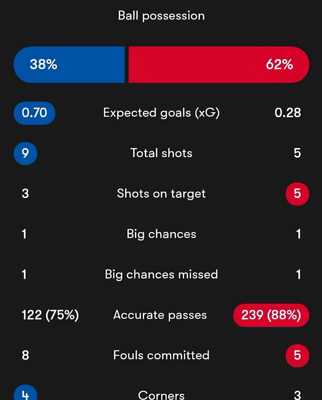 正因此,当全场数据的统计到来之后,拜仁的预期进球也从半场的0.28来到了2.9,射门也从上半场的5次来到了最终的18次,比分也从半场看似胶着的0-1变成了实力差距明显的1-4;