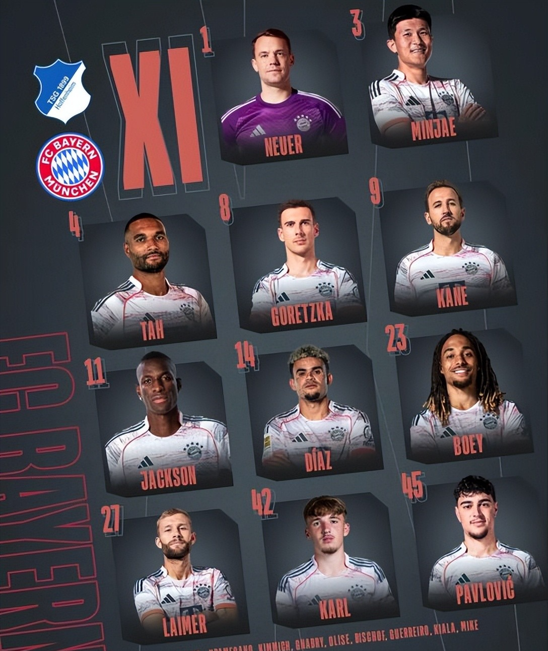 不知道为何本场的拜仁并没有轮休凯恩而选择了让他继续首发,但或许一个人尽皆知的情形就是、替补席压根没人可以轮换。如果卡尔还尚可轮换奥丽塞尔、雅克松也能让格纳布里喘口气、帕夫洛维奇和比朔夫也能让基卡组合不那么劳累的话,拜仁阵容似乎目前真的找不到的就是凯恩和迪亚斯的替补人选。