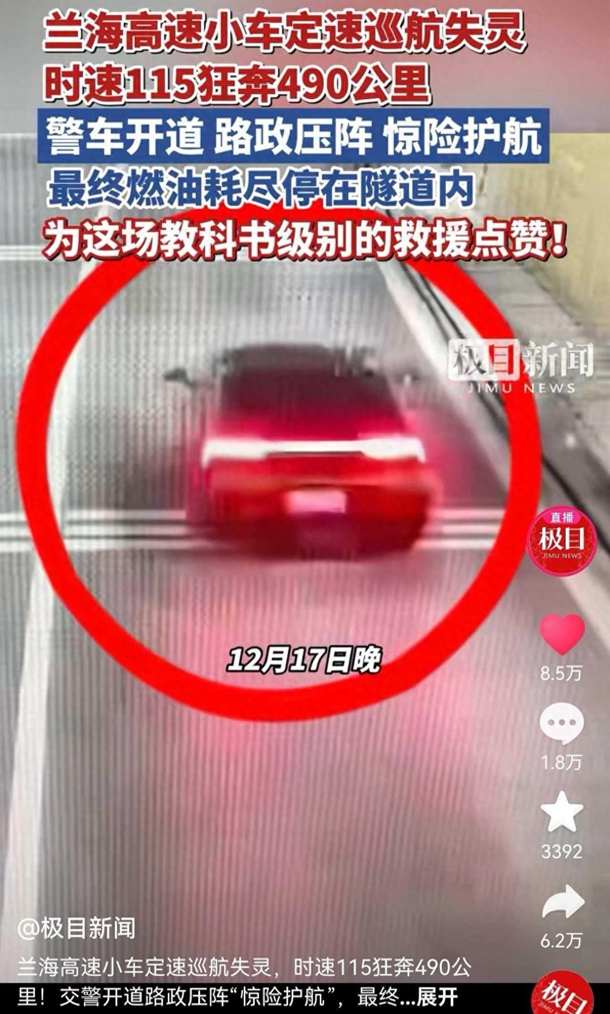 车上女伴当场吓哭,他自己也慌了神,"当时头皮发麻,车子像脱缰野马在车流里冲"。危急之际,他强令自己镇定下来。迅速开启双闪、鸣响喇叭,旋即紧急报警,而后在川流不息的车阵中,毅然冒险取道应急车道穿行而去。交警和路政部门迅速响应,10 多辆车组成护航队,封闭沿途收费站开辟安全通道。
