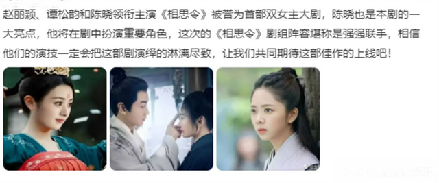 《相思令》倘若这次真是有赵丽颖、陈晓、谭松韵三人联手,演员阵容不错,热度和收视都稳了,要流量了有流量、要人气有人气,质量有保障,你们期待他们三人合作吗?还是说你们心中有更合适的演员人选呢?