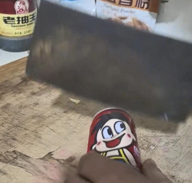 为了看清楚,孩子父亲从厨房拿出砍刀,狠狠用力往瓶中间一剁,铁瓶被开出了一道裂缝,然后费了老劲才把瓶子彻底打开。