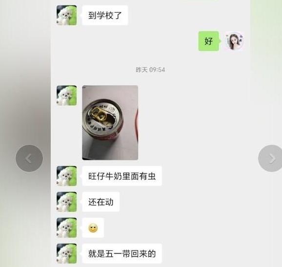 这还不算严重的,还有一位妈妈表示,她给女儿买了一箱旺仔牛奶带去学校,没想到女儿喝到了虫子。