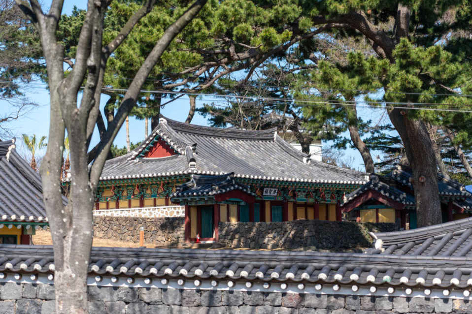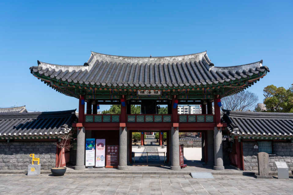 济州市区距离机场不过十来分钟车程,巴士很快驶入了城区。我正懒洋洋地靠在窗边,忽然瞥见街角一座古朴的院落,一道青绿色的木门在阳光下静静伫立。直觉告诉我,那大概率是一处历史遗址。我没有犹豫就按下了下车铃,临时改变了原定的先去酒店的计划。走近那座建筑,门口挂着一个写有汉字的标牌,这里是济州乡校(Jeju Hyanggyo)。这是 朝鲜 王朝设立的儒学教育机构,肩负着地方教化与育才的职责。乡校不仅是教学场所,更承载着国家对百姓思想的塑形,是儒家理想社会在边地的具象体现。济州乡校的历史可以追溯到高丽王朝,初建于十四世纪,之后在 朝鲜 初期得以重建,如今成为济州地区保留最为完好的传统教 育空 间之一。青瓦飞檐掩映于古木之间,最深处那座庄严肃穆的大殿赫然矗立,它是整座乡校的核心,用来供奉孔子及儒家先贤神位的场所。殿门紧闭,透着时光留下的沉静与庄重。我站在门前,没有打扰这个古朴的院落,只是望着古建筑跨越百年的眼睛,慢慢被这座岛屿柔和的历史气息轻轻包裹,旅途的步伐就这样,被一段不期而遇的儒学风景悄然带慢了。