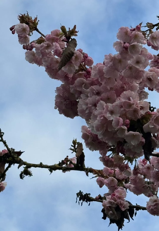 第一张是樱花照,粉粉的樱花在蓝天的衬托下显得格外好看,花朵一簇一簇的,看着生机勃勃,给人一种春天很美好的感觉。