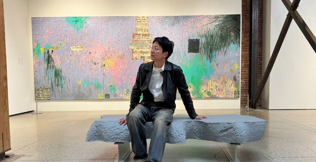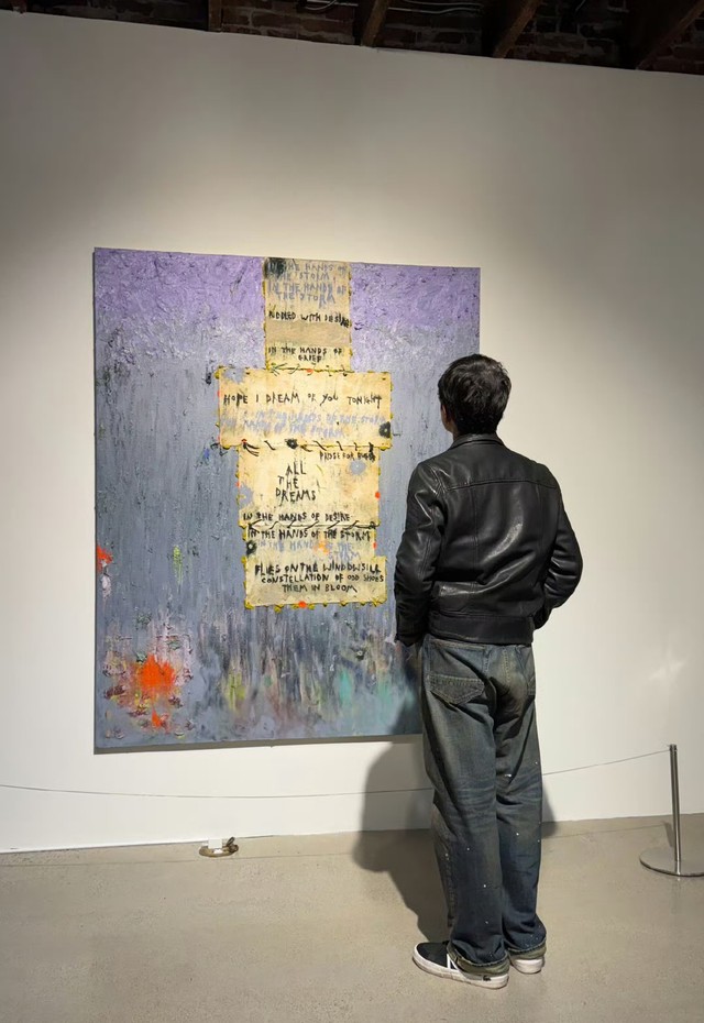 背对着镜头,站在一幅画前,像是在看画,这幅画的颜色主要是紫色,上面贴着写着带字的纸片,整个照片透着股文艺、安静的氛围。