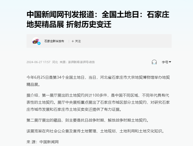 在全国第34个土地日到来之际,河北省石家庄市大宗地契博物馆于6月25日精心策划了一场别开生面的地契精品展,以独特的视角展现了土地变迁的历史脉络。