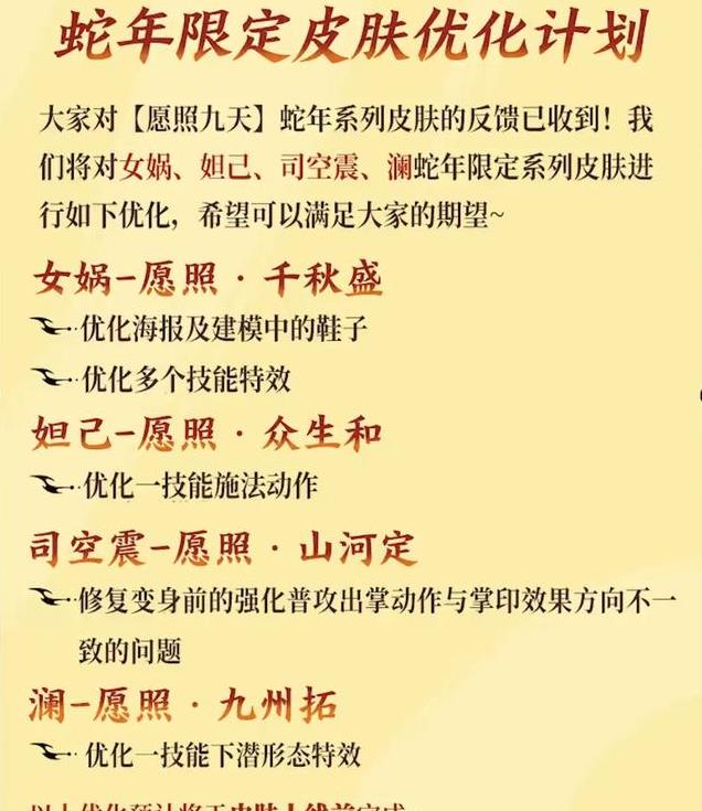具体优化内容可以看上图,大家吐槽较多的女娲技能特效、澜一技能下潜特效等,都一并会在皮肤上线前完成优化。
