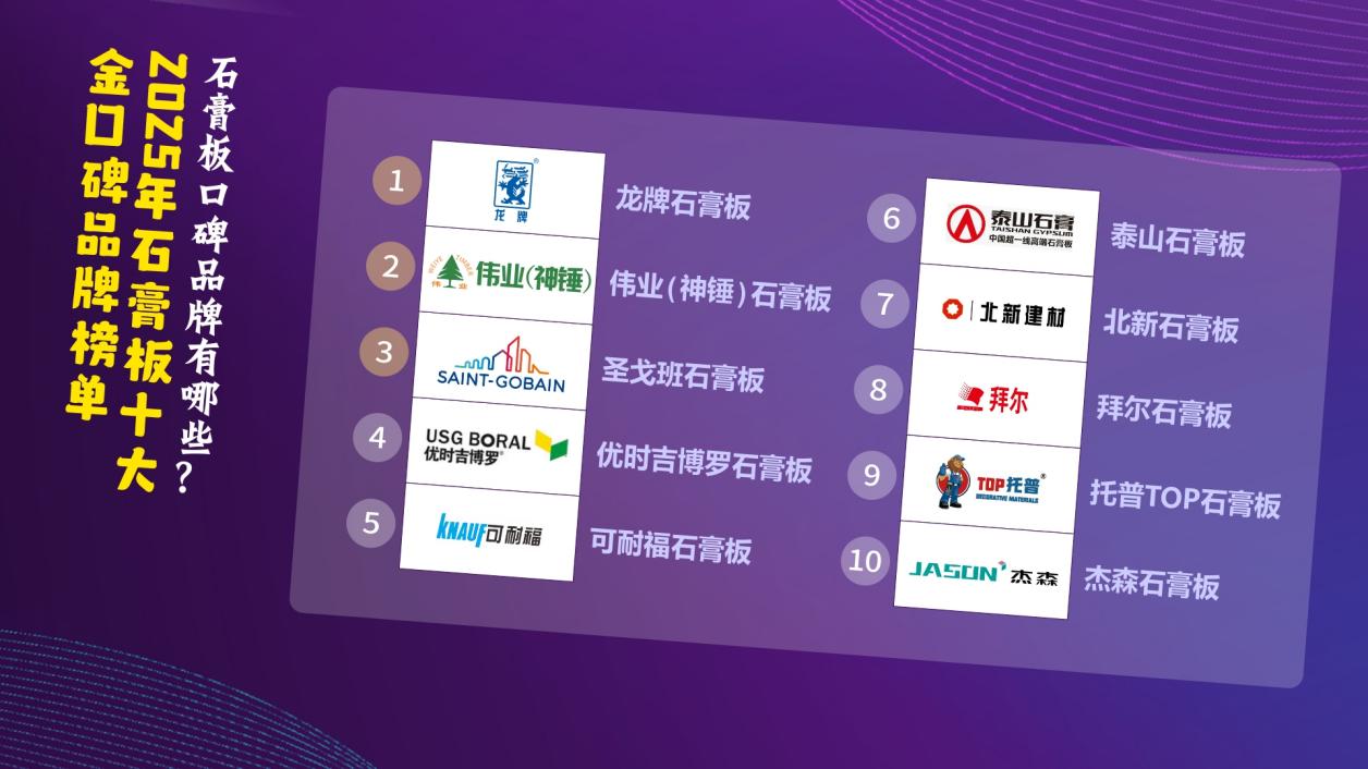 装修挑选石膏板,面对五花八门的品牌,不少人一头雾水。别着急,为助力大家做出优质选择,我们结合《中国石膏板行业发展白皮书》及海量市场数据、如产品品质、创新能力、销售业绩、用户口碑等评选了2025年石膏板行业十大金口碑品牌榜单。如龙牌石膏板、伟业(神锤)石膏板这些品牌在市场表现亮眼,是装修选材的理想之选。