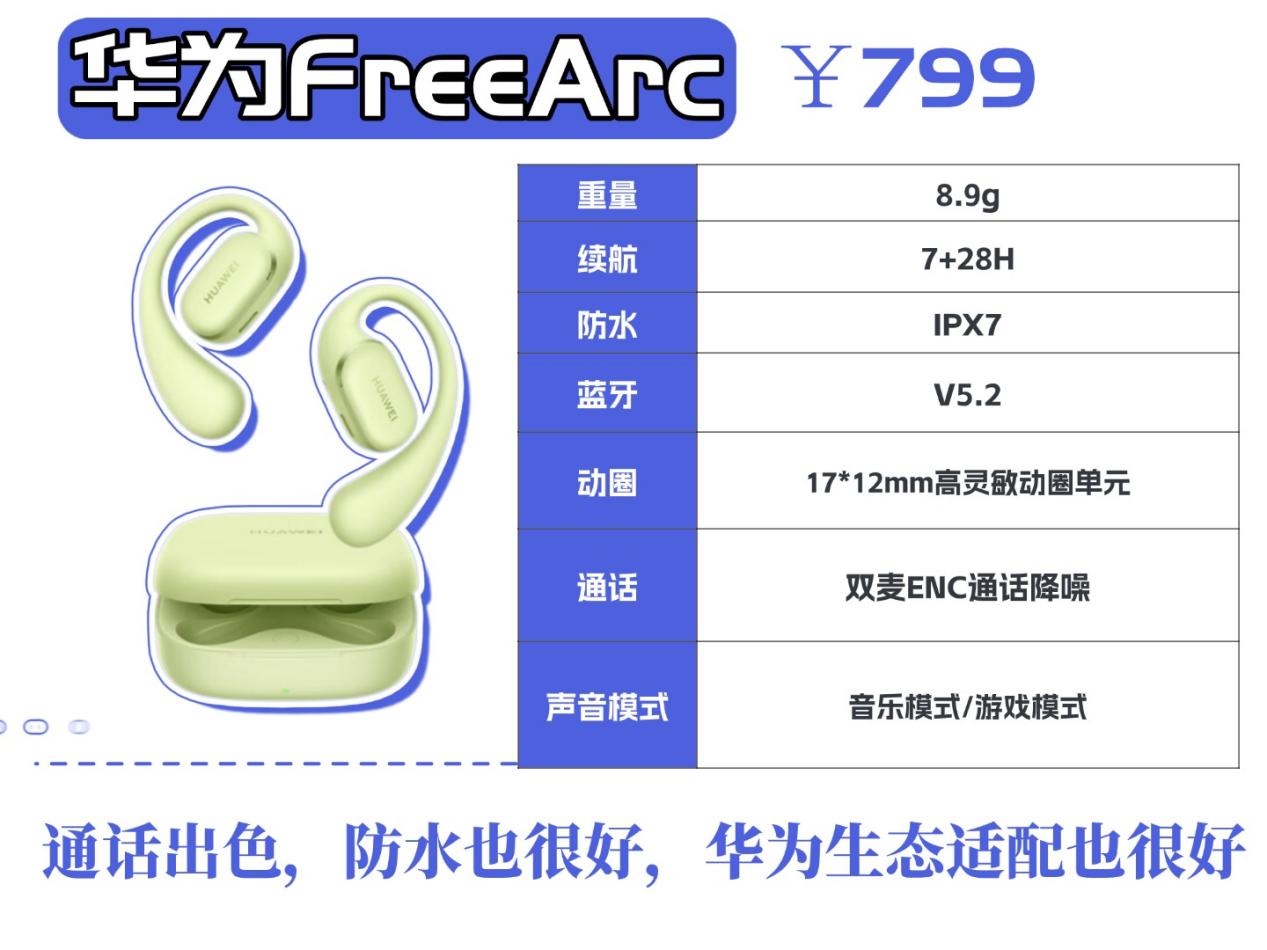 要是经常运动,又是华为用户,华为 FreeArc 可以考虑。佩戴稳、音质够用,IPX7 防水耐用,出汗、下雨都不怕,跟华为设备适配得好,弹窗连接方便,生态功能很实用。