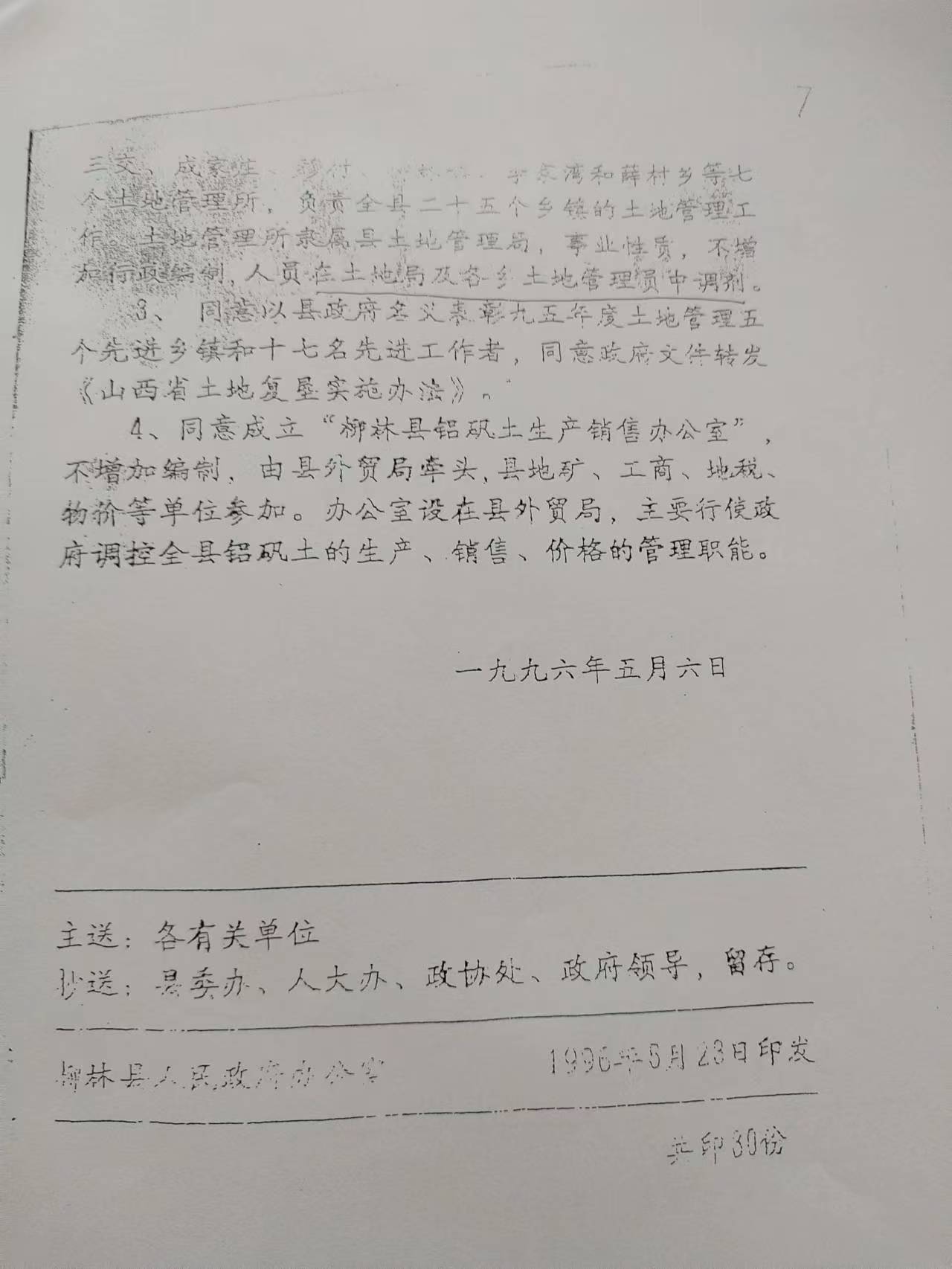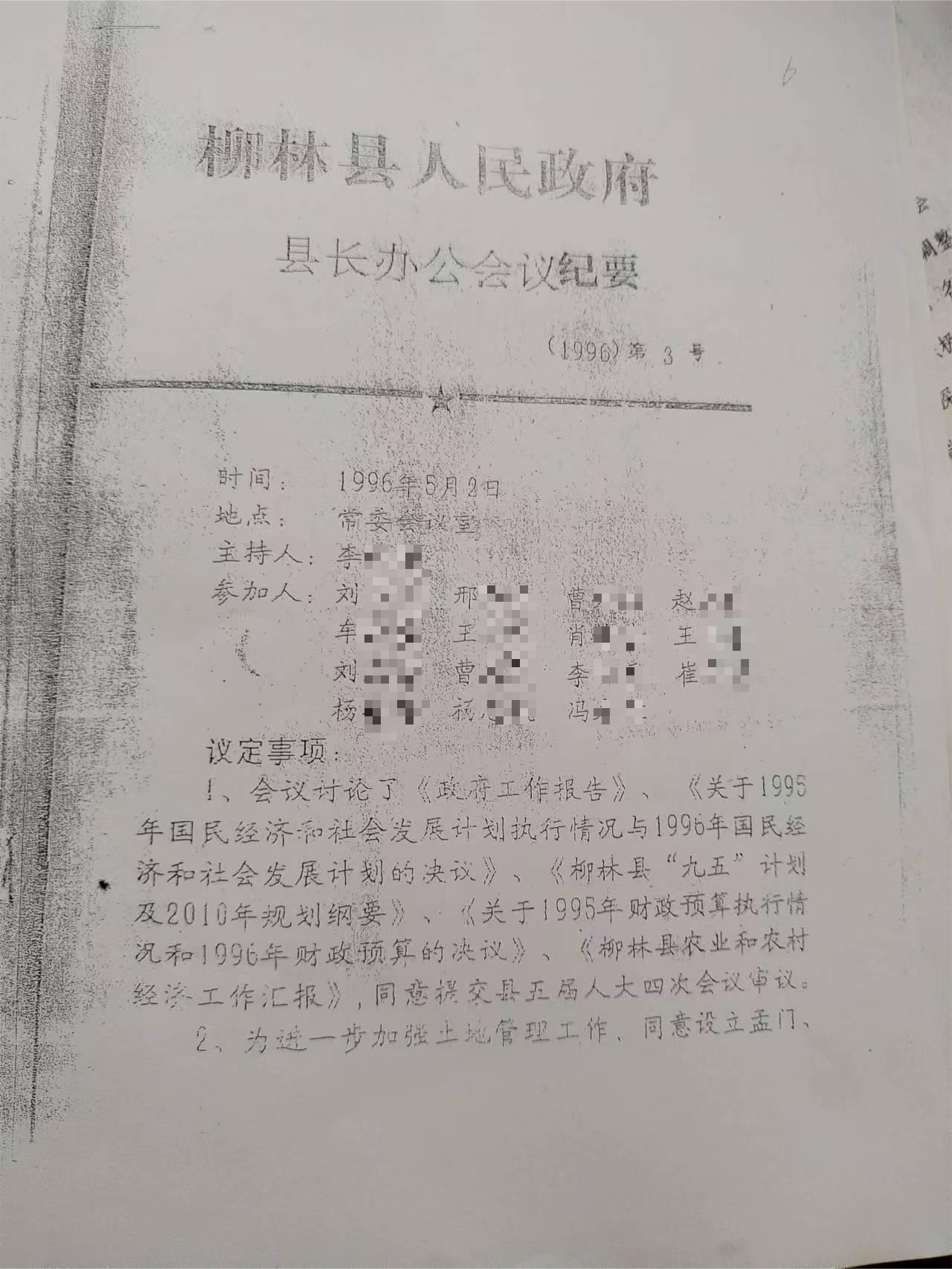 1996 年 5 月 2 日,柳林县召开县长办公会议,会议纪要明确载明:“同意设立孟门、三交等七个土地管理所,属事业性质,不新增行政编制,人员从县土地局及各乡土地管理员中调剂配备。” 这份编号为(1996)第 3 号的会议纪要,连同当年 6 月县编制委员会的相关批复,共同构成了土地管理员身份认定与编制落实的合规依据。