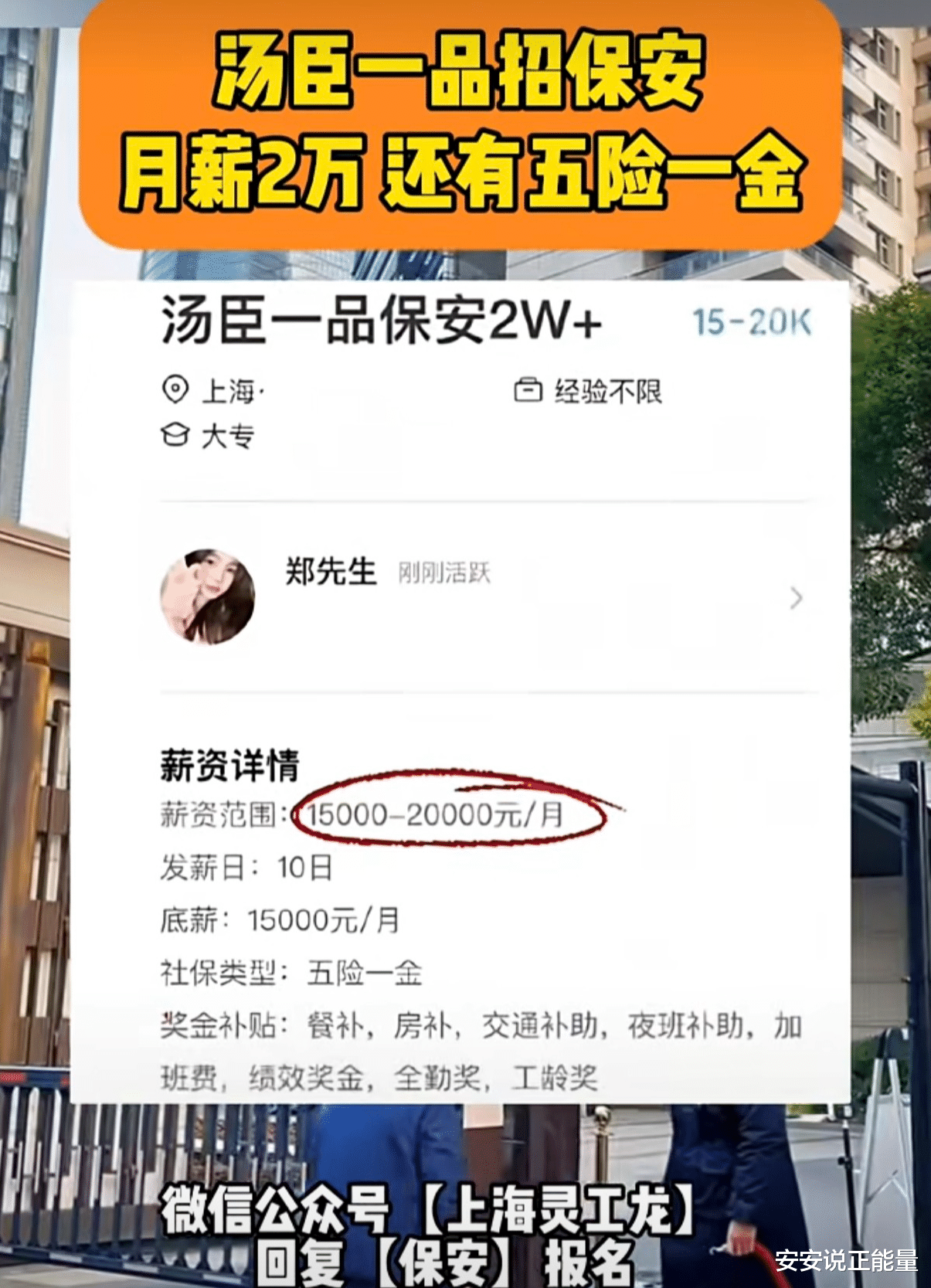 月薪2万不是!上海小区招聘保安:月工资20000,购买五险一金,有餐补、房补、交通补助、夜班补助,还有各种奖