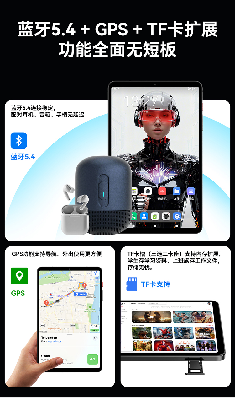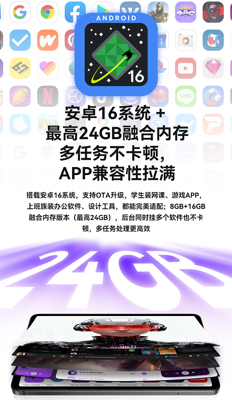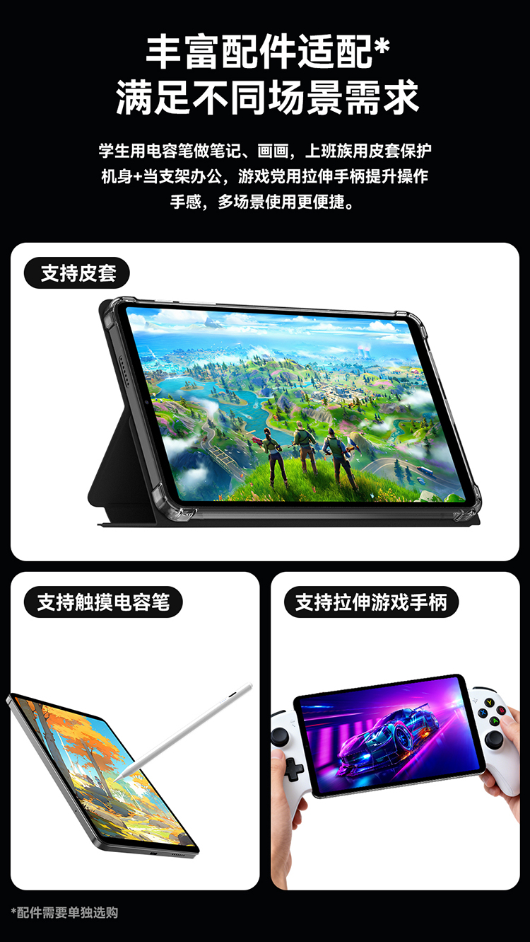 它并非只有“面子”,更有“里子”。全金属机身提供了坚固的保护与出众的质感;双BOX扬声器带来沉浸式影音;5000mAh电池搭配PD快充,保证了5-6小时的持续续航。此外,它还支持丰富的配件生态,从皮套、电容笔到游戏拉伸手柄,无论是学习笔记、移动办公还是畅玩模拟器游戏,都能无缝切换,满足全场景需求。