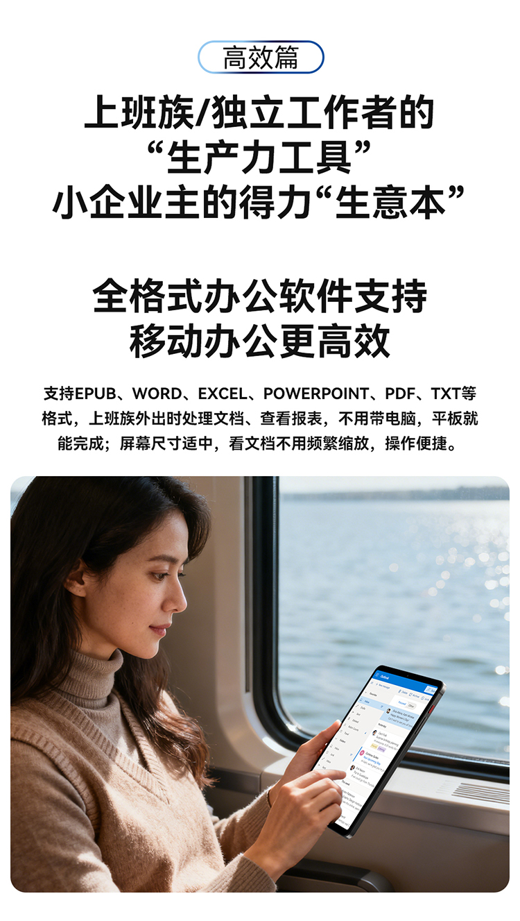 对于职场人士,BPad T1同样出色,它支持EPUB、WORD、EXCEL、PDF等全格式办公文档,配合Type-C接口可外接键鼠,轻松变身“迷你电脑”,随时随地处理工作。