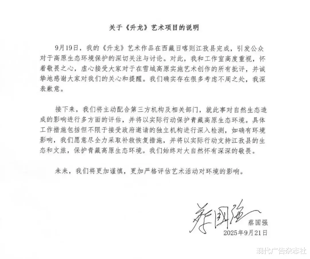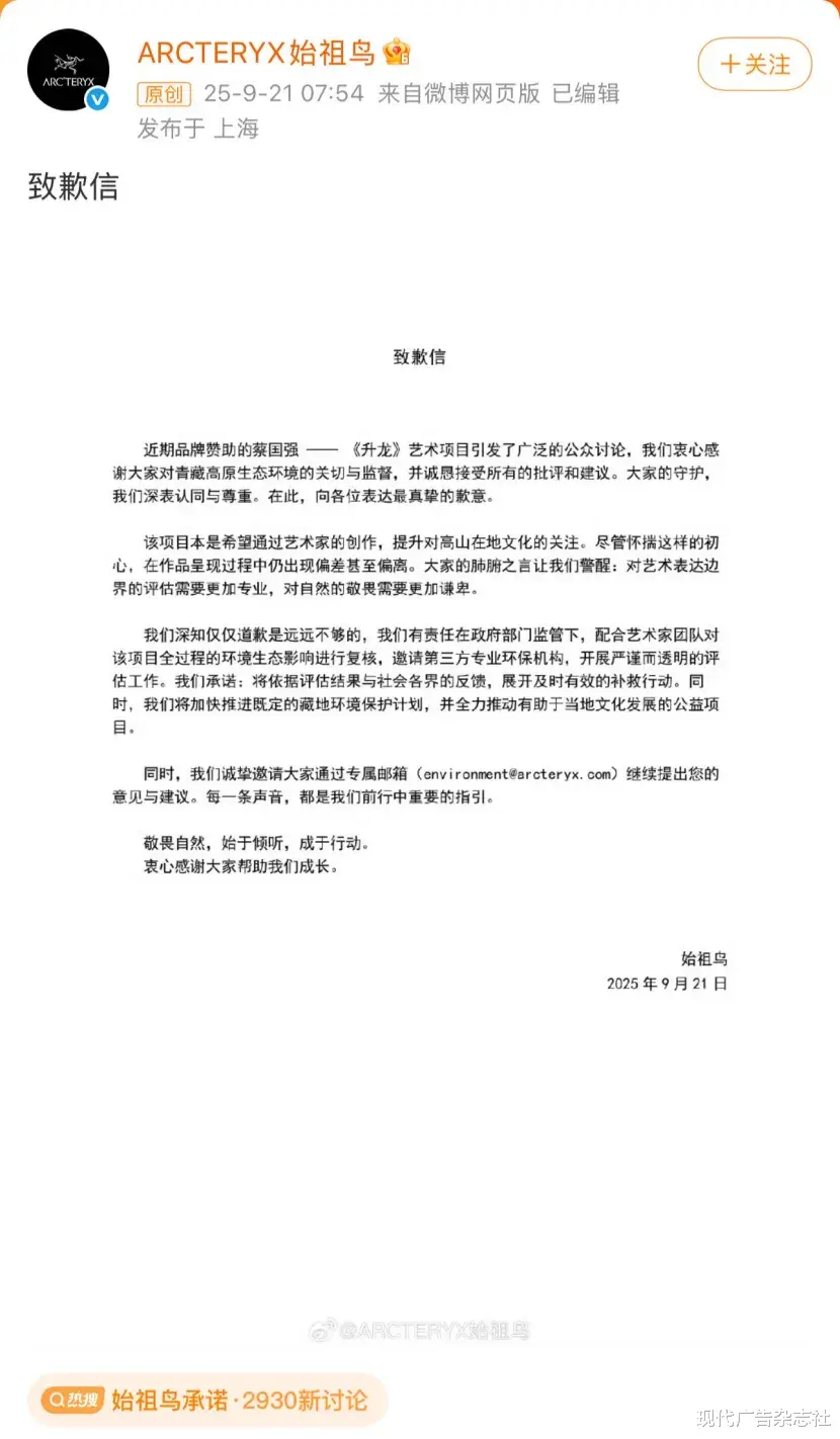 原本以“环保先锋”自居的始祖鸟,在这场风波中迅速失去了平日积累的道德光环。它在营销中反复强调的环保理念,在高原烟花的爆炸声中显得异常讽刺。烟火熄灭,公众的愤怒却燃烧了起来。9月21日,始祖鸟和蔡国强工作室相继发布了致歉声明,看似试图止血,然而这份道歉所呈现出的内外两套说辞,却未曾平复舆论,反而引发持续发酵。