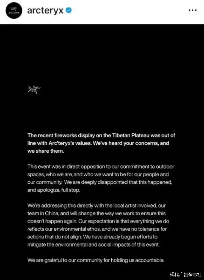 在国内社交平台上,始祖鸟的致歉信显得颇为谦卑。它承认自己在“艺术表达边界”上的评估不足,表示要对自然保持更大的敬畏,承诺在政府监管下复核项目的生态影响,邀请第三方机构进行评估,并依结果进行补救,同时还宣称将长期推进藏地环保计划与文化公益项目。这样的措辞看似诚恳,姿态放低,满足了国内舆论场所要求的基本要件。然而,当人们把目光投向海外社交媒体,却发现另一份英文版道歉完全是另一番表述。