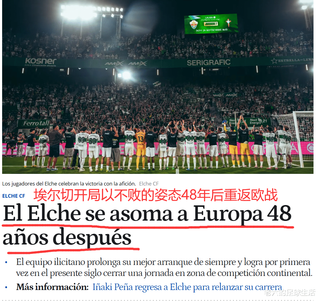 目前埃尔切是来到了欧战区,并且他与巴萨皇马一样是西甲里保持不败的球队,这也是俱乐部48年后的首次重返欧战区。