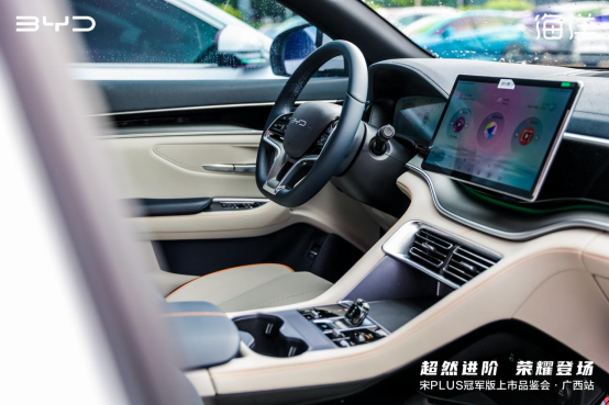 内饰已经是大家所熟知的,没有太大的变化。最明显的变化主要有两点,第一是方向盘上的车标由“宋”改为“BYD”,第二是换上了与比亚迪海豹相同的水晶档把。一体式的双拼色座椅与这款车的年轻运动外形完美搭配,使得整个车身线条更加流畅。