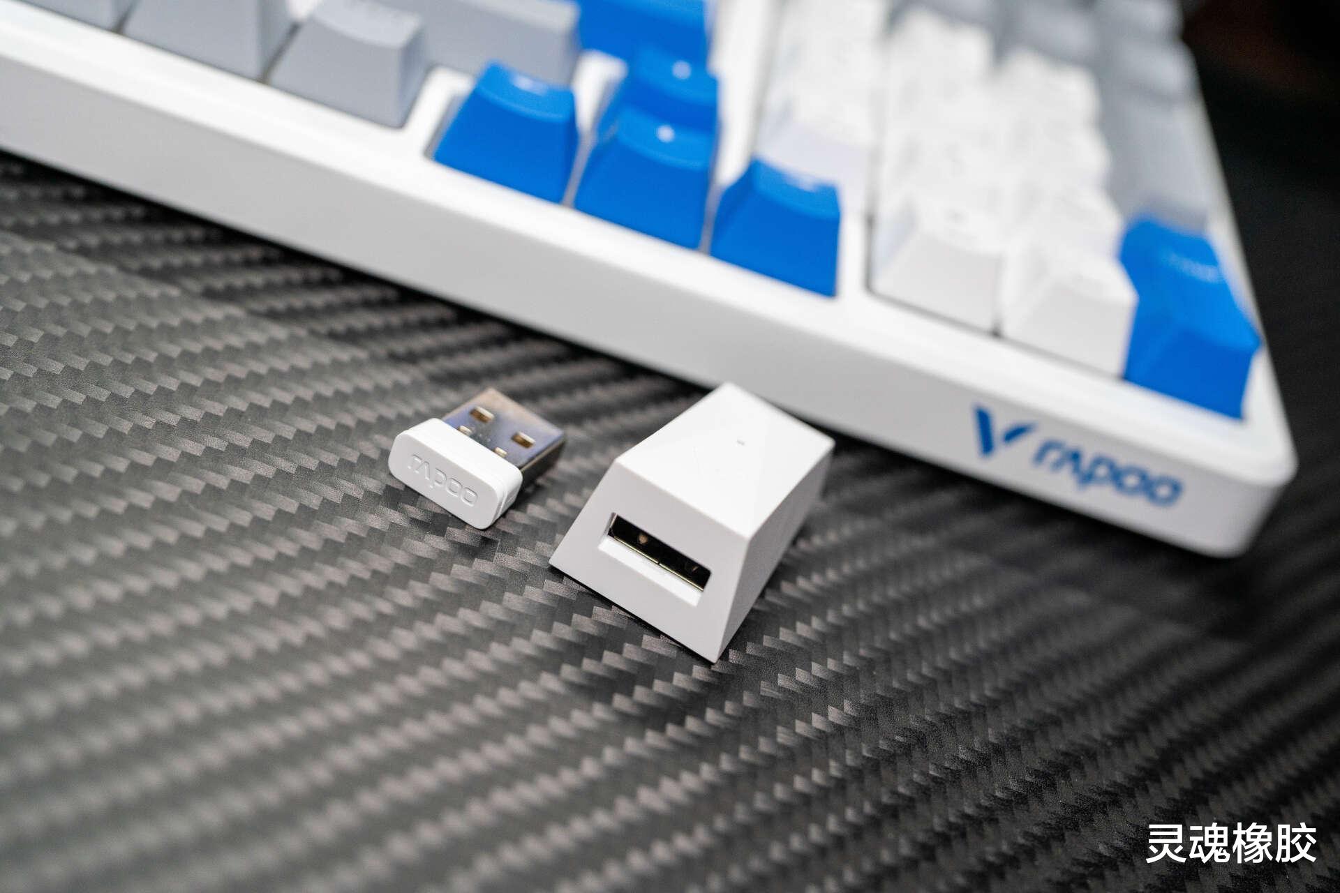 2.4G接收器隐藏在了键盘右上角的“时空幻境仓”内,里面有装饰灯,开启无线模式的时候,这个指示灯会通过颜色的改变提醒用户注意键盘的电量,及时补电,以免忘记充电在使用中突然断电,就尴尬了。